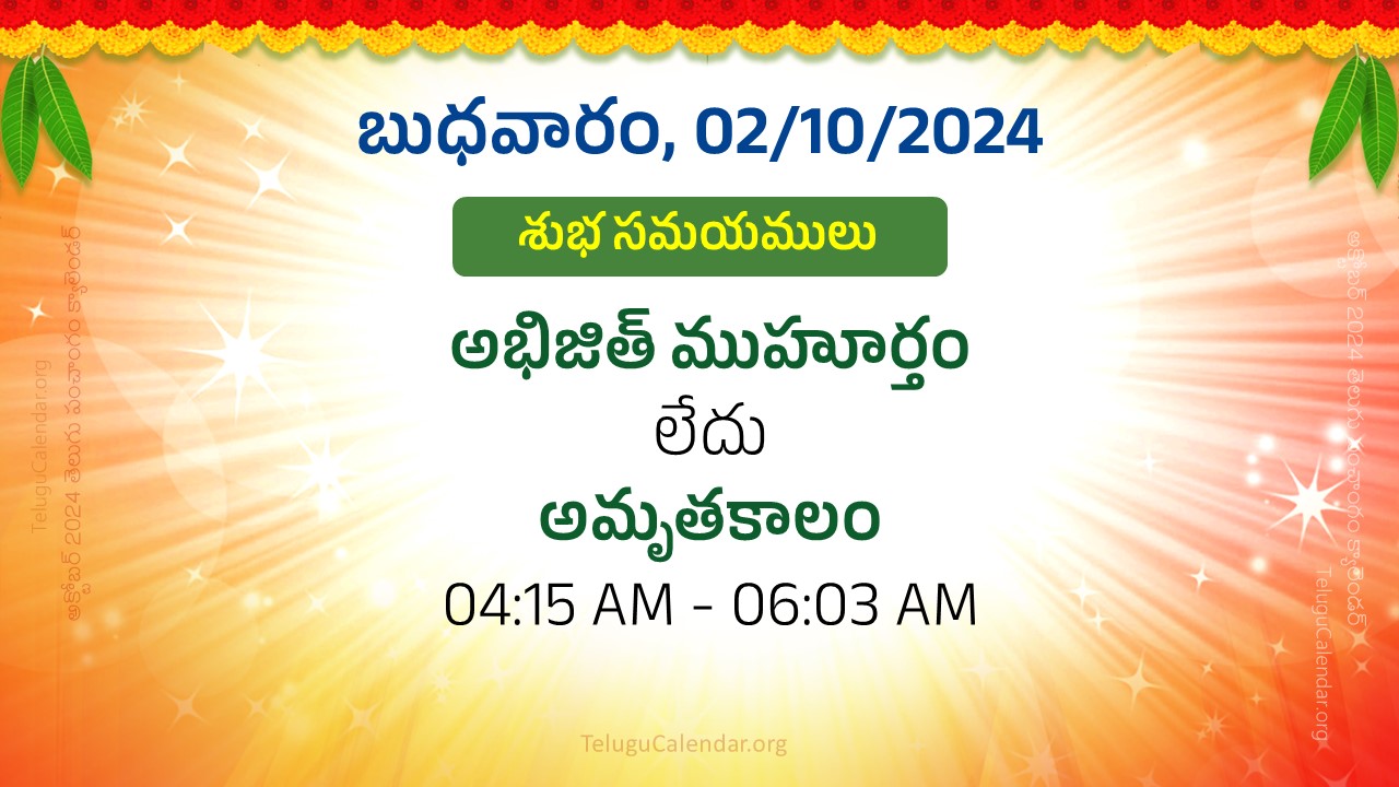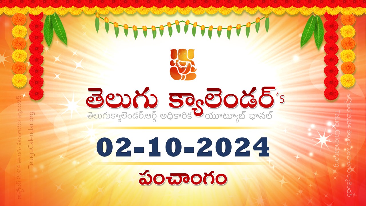 ముహుర్తాలు, శుభకార్యాలు, పండుగలు, వ్రతాలు మరియు ఇతర ముఖ్యమైన మంచి కార్యక్రమాలకు భారతదేశ హిందువులు సంప్రదాయ కాలగణన సాధనం పంచాంగాన్ని పరిగణనలోకి తీసుకుంటారు. అక్టోబర్ 2, 2024 (2-10-2024) తిథి, వారం, నక్షత్రం, కరణం, యోగం.. ఈ ఐదింటి కలయికే పంచాంగం. ఇది శుభ సమయాలు (శుభ ముహుర్తాలు), అశుభ సమయాలు (అశుభ ముహుర్తాలు), సూర్యోదయం లాంటి విషయాల గురించి తెలియజేస్తుంది. పంచాంగం కాలగణనకు అనేక పద్దతులు ఉన్నా ‘సూర్యమానం’, చంద్రమానం’ విధానాలే ప్రస్తుతం అమలులో ఉన్నాయి. తెలుగు రాష్ట్రాల వారు చంద్రమానాన్నే అనుసరిస్తారు. చంద్రమానం ప్రకారం తెలుగు సంవత్సరాది (ఉగాది) ఛైత్రమాసంతో ప్రారంభమై, ఫాల్గుణమాసంతో పూర్తవుతుంది. గ్రెగేరియన్ క్యాలెండర్తోపాటు చంద్రమానం (దృగ్గణిత సిద్ధాంతం) అనుసరించి రూపొందించిన రోజువారీ తెలుగు పంచాంగం 2 అక్టోబర్ 2024.