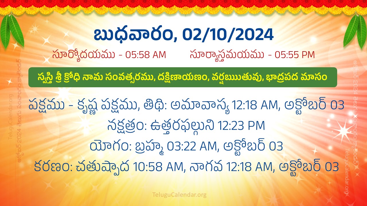 Andhra Pradesh & Telangana Telugu Panchangam 2024 October, you can also find the Telugu Year, Rutuvu, Telugu Month, Tithi, Nakshatra, Yogam & Karanam (The start time of a Tithi & Nakshatram will be the end time of the previous timings) with good and bad timings. Telugu Festivals 2024 Click here. Telugu Panchangam 2025 Click here.