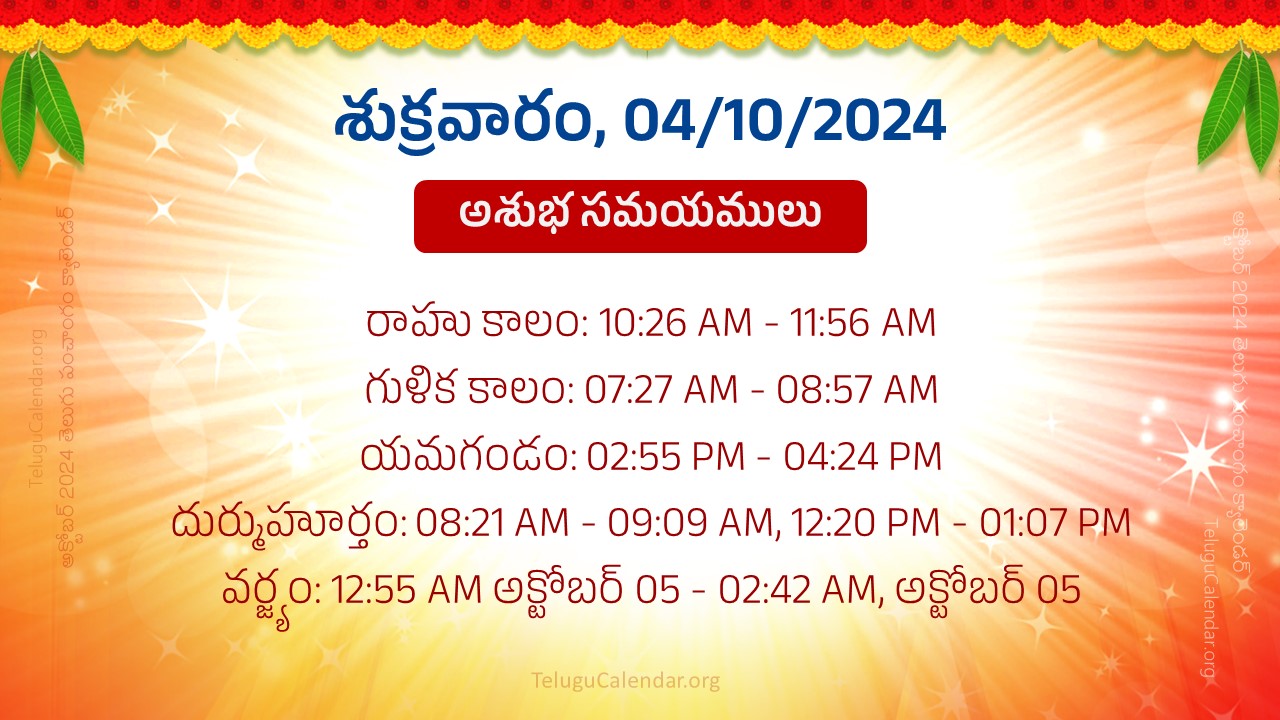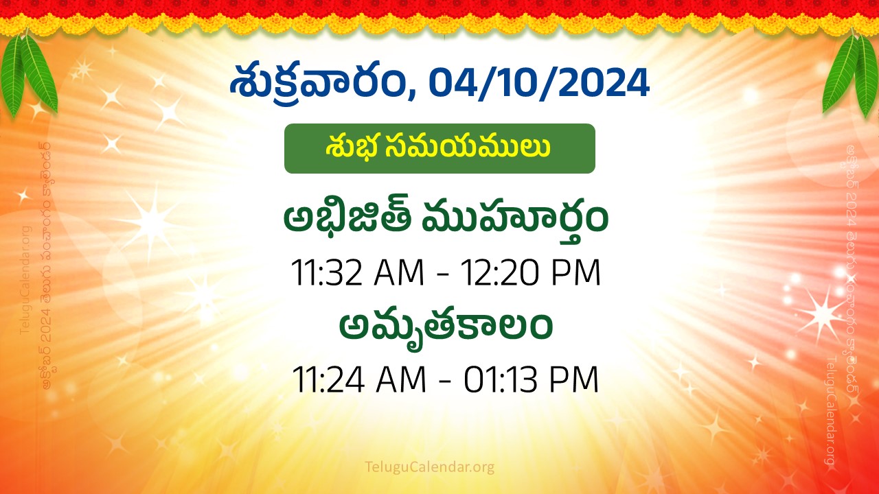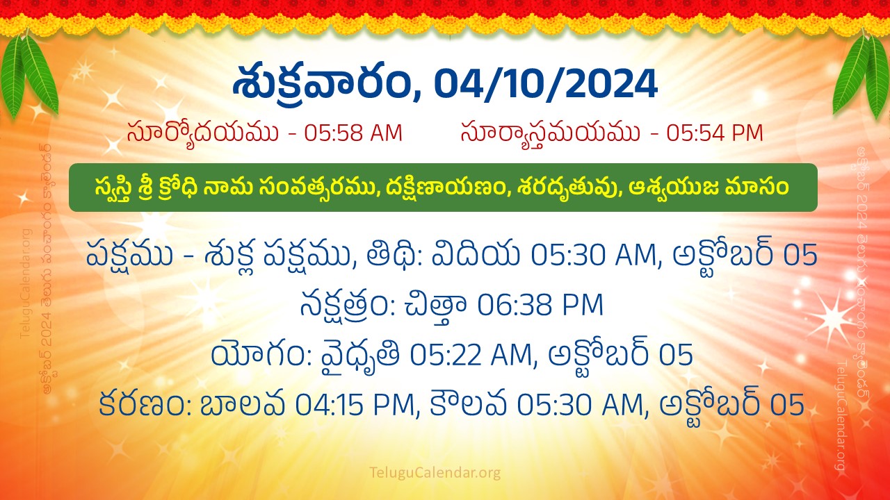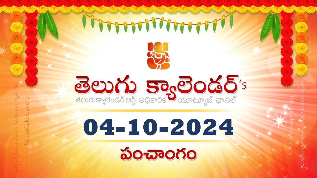 ముహుర్తాలు, శుభకార్యాలు, పండుగలు, వ్రతాలు మరియు ఇతర ముఖ్యమైన మంచి కార్యక్రమాలకు భారతదేశ హిందువులు సంప్రదాయ కాలగణన సాధనం పంచాంగాన్ని పరిగణనలోకి తీసుకుంటారు. అక్టోబర్ 4, 2024 (4-10-2024) తిథి, వారం, నక్షత్రం, కరణం, యోగం.. ఈ ఐదింటి కలయికే పంచాంగం. ఇది శుభ సమయాలు (శుభ ముహుర్తాలు), అశుభ సమయాలు (అశుభ ముహుర్తాలు), సూర్యోదయం లాంటి విషయాల గురించి తెలియజేస్తుంది. పంచాంగం కాలగణనకు అనేక పద్దతులు ఉన్నా ‘సూర్యమానం’, చంద్రమానం’ విధానాలే ప్రస్తుతం అమలులో ఉన్నాయి. తెలుగు రాష్ట్రాల వారు చంద్రమానాన్నే అనుసరిస్తారు. చంద్రమానం ప్రకారం తెలుగు సంవత్సరాది (ఉగాది) ఛైత్రమాసంతో ప్రారంభమై, ఫాల్గుణమాసంతో పూర్తవుతుంది. గ్రెగేరియన్ క్యాలెండర్తోపాటు చంద్రమానం (దృగ్గణిత సిద్ధాంతం) అనుసరించి రూపొందించిన రోజువారీ తెలుగు పంచాంగం 4 అక్టోబర్ 2024.