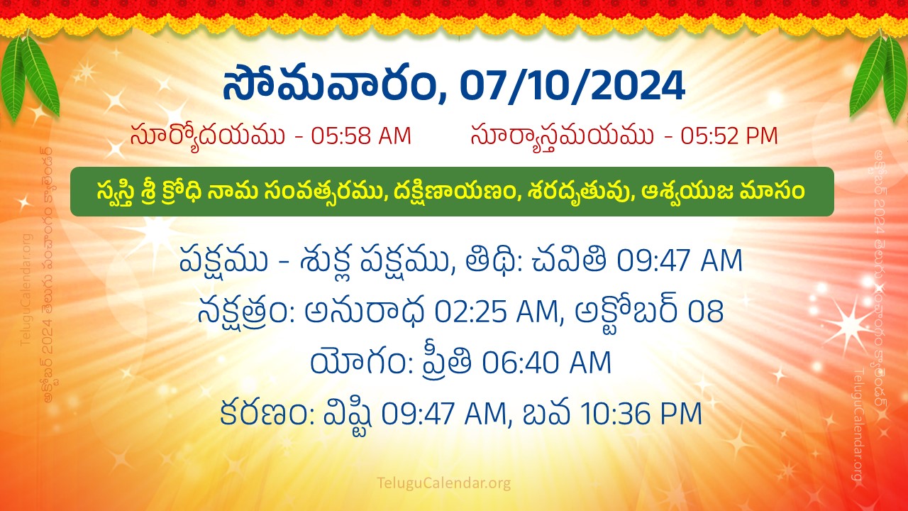 Andhra Pradesh & Telangana Telugu Panchangam 2024 October, you can also find the Telugu Year, Rutuvu, Telugu Month, Tithi, Nakshatra, Yogam & Karanam (The start time of a Tithi & Nakshatram will be the end time of the previous timings) with good and bad timings. Telugu Festivals 2024 Click here. Telugu Panchangam 2025 Click here.