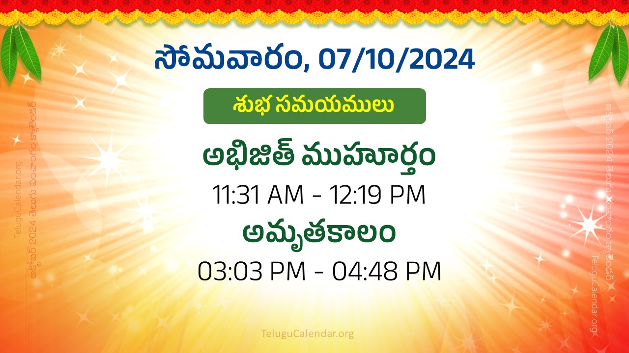 ముహుర్తాలు, శుభకార్యాలు, పండుగలు, వ్రతాలు మరియు ఇతర ముఖ్యమైన మంచి కార్యక్రమాలకు భారతదేశ హిందువులు సంప్రదాయ కాలగణన సాధనం పంచాంగాన్ని పరిగణనలోకి తీసుకుంటారు. అక్టోబర్ 7, 2024 (7-10-2024) తిథి, వారం, నక్షత్రం, కరణం, యోగం.. ఈ ఐదింటి కలయికే పంచాంగం. ఇది శుభ సమయాలు (శుభ ముహుర్తాలు), అశుభ సమయాలు (అశుభ ముహుర్తాలు), సూర్యోదయం లాంటి విషయాల గురించి తెలియజేస్తుంది. పంచాంగం కాలగణనకు అనేక పద్దతులు ఉన్నా ‘సూర్యమానం’, చంద్రమానం’ విధానాలే ప్రస్తుతం అమలులో ఉన్నాయి. తెలుగు రాష్ట్రాల వారు చంద్రమానాన్నే అనుసరిస్తారు. చంద్రమానం ప్రకారం తెలుగు సంవత్సరాది (ఉగాది) ఛైత్రమాసంతో ప్రారంభమై, ఫాల్గుణమాసంతో పూర్తవుతుంది. గ్రెగేరియన్ క్యాలెండర్తోపాటు చంద్రమానం (దృగ్గణిత సిద్ధాంతం) అనుసరించి రూపొందించిన రోజువారీ తెలుగు పంచాంగం 7 అక్టోబర్ 2024.