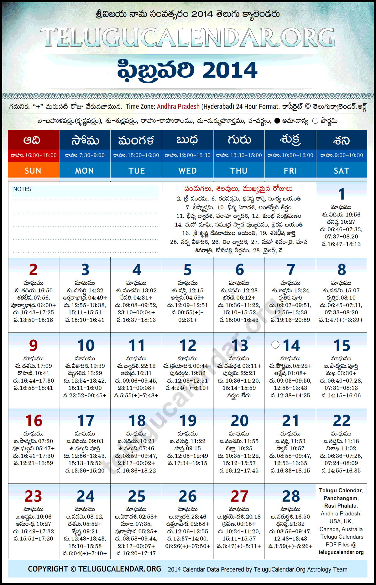 Telugu Calendar 2014 February Andhra Pradesh (Hyderabad) with Telugu Festivals.