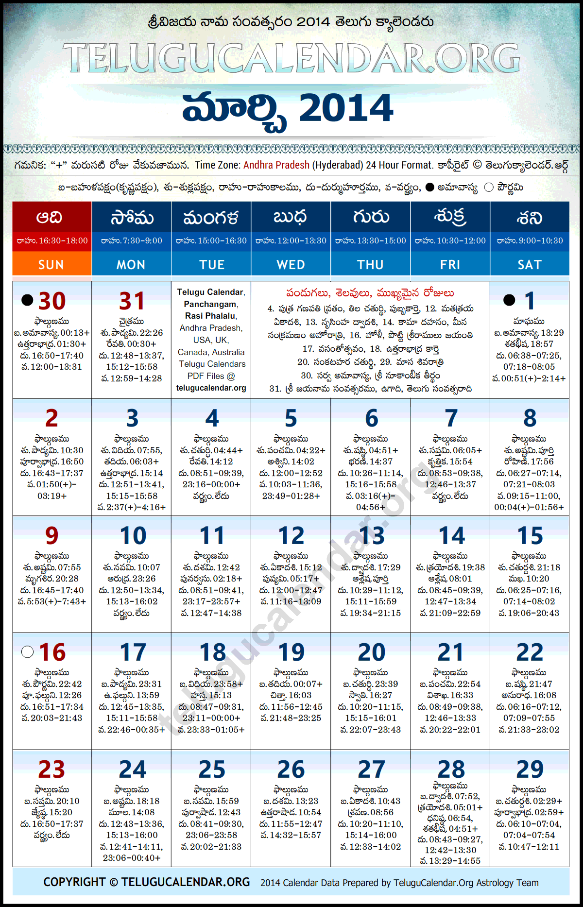 Telugu Calendar 2014 March Andhra Pradesh (Hyderabad) with Telugu Festivals.