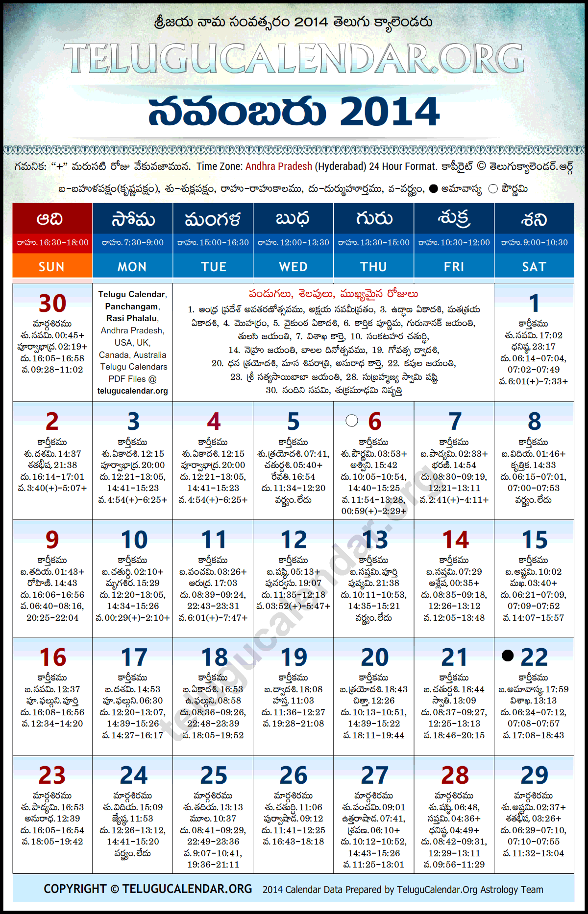 Telugu Calendar 2014 November Andhra Pradesh (Hyderabad) with Telugu Festivals.