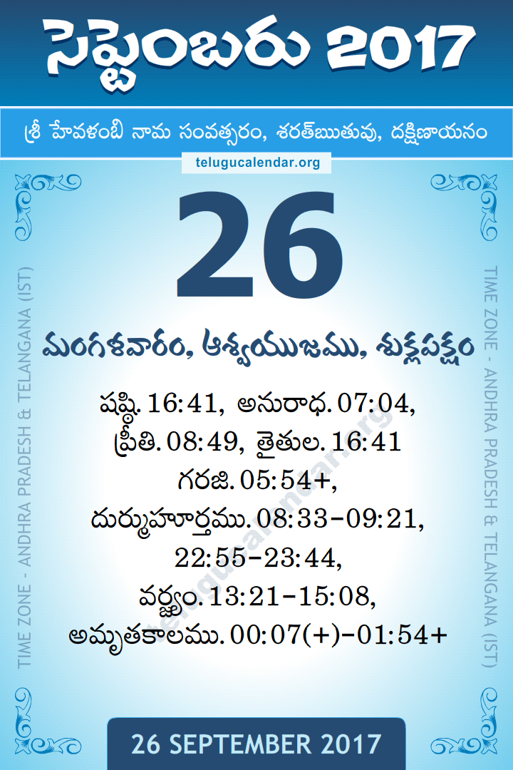 Tuesday, 26-9-2017. Sri Hevalambi Nama Samvatsaram, Dakshinayanam, Sharad Ruthuvu, Ashwin Masam, Shukla Paksham.