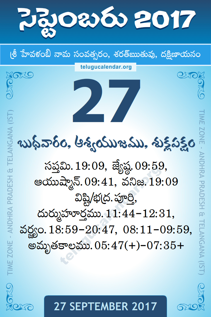 Wednesday, 27-9-2017. Sri Hevalambi Nama Samvatsaram, Dakshinayanam, Sharad Ruthuvu, Ashwin Masam, Shukla Paksham.