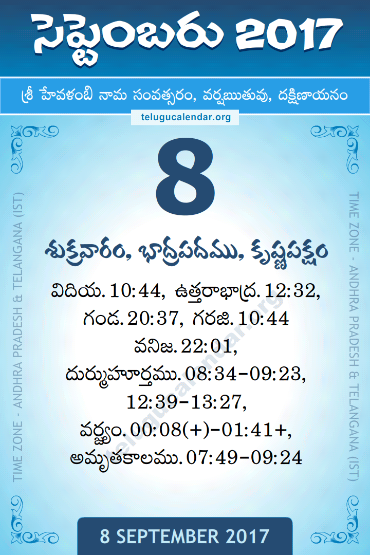 Friday, 8-9-2017. Sri Hevalambi Nama Samvatsaram, Dakshinayanam, Varsha Ruthuvu, Bhadrapada Masam, Krishna Paksham.
