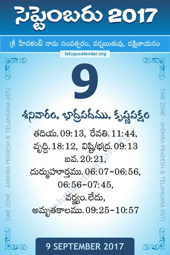 Saturday, 9-9-2017. Sri Hevalambi Nama Samvatsaram, Dakshinayanam, Varsha Ruthuvu, Bhadrapada Masam, Krishna Paksham.