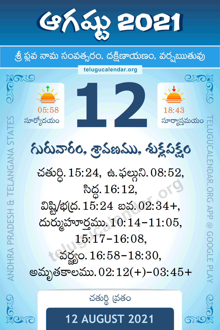 August 12, 2021 Panchangam Telugu Calendar Daily. Sri Plava Nama Samvatsaram, Dakshinayanam, Varsha Rutuvu, Shraavana Masam, Shukla Paksham.