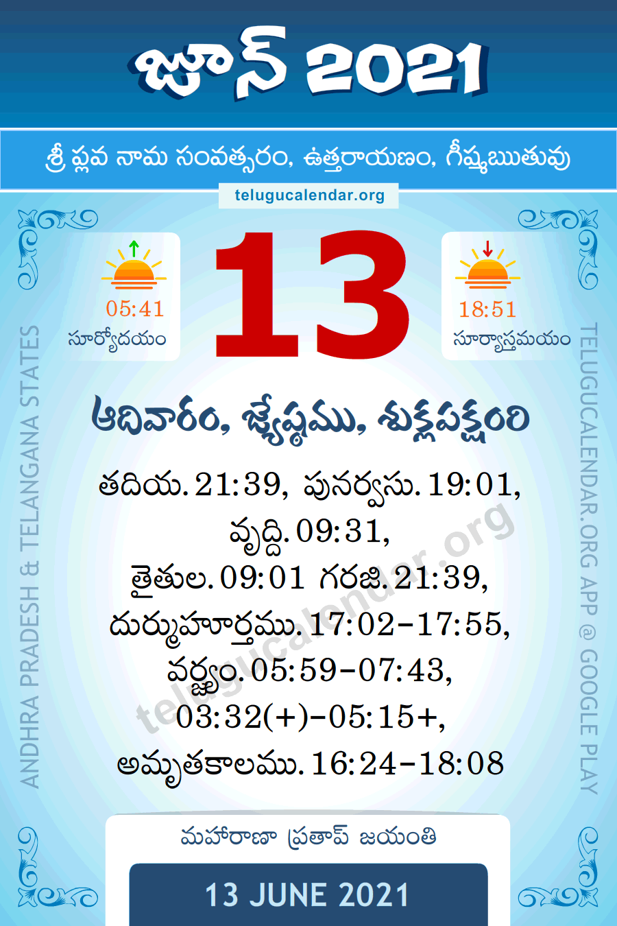 June 13, 2021 Panchangam Telugu Calendar Daily. Sri Plava Nama Samvatsaram, Uttarayanam, Greeshma Rutuvu, Jyeshta Masam, Shukla Paksham.
