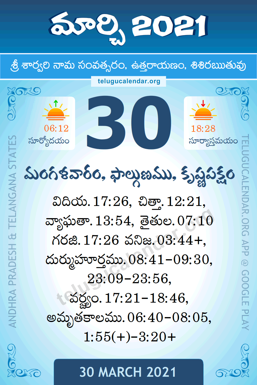 March 30, 2021 Panchangam Telugu Calendar Daily. Sri Sarvari Nama Samvatsaram, Uttarayanam, Shishira Rutuvu, Phalguna Masam, Krishna Paksham.