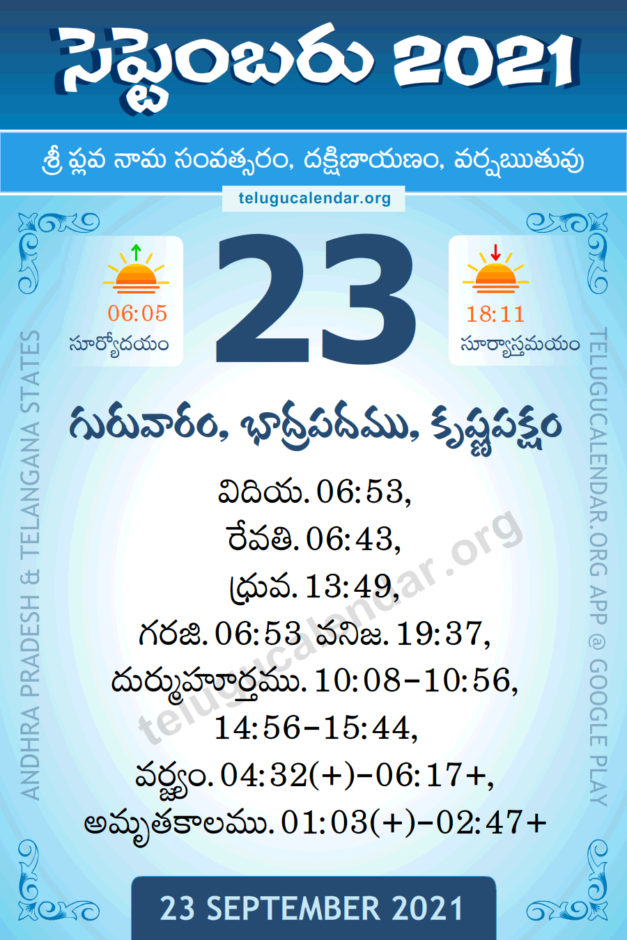 September 23, 2021 Panchangam Telugu Calendar Daily. Sri Plava Nama Samvatsaram, Dakshinayanam, Varsha Rutuvu, Bhadrapada Masam, Krishna Paksham.