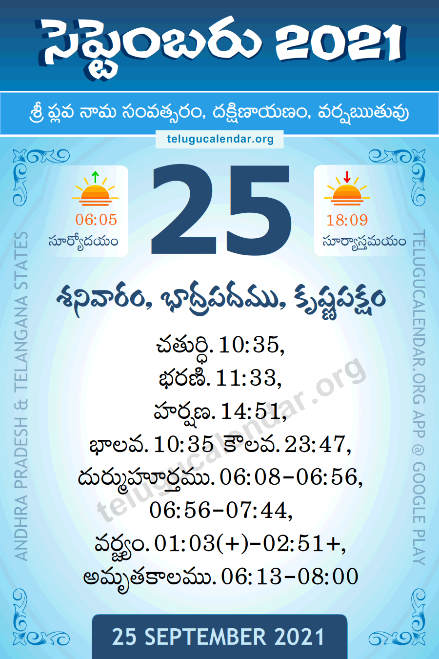 September 25, 2021 Panchangam Telugu Calendar Daily. Sri Plava Nama Samvatsaram, Dakshinayanam, Varsha Rutuvu, Bhadrapada Masam, Krishna Paksham.