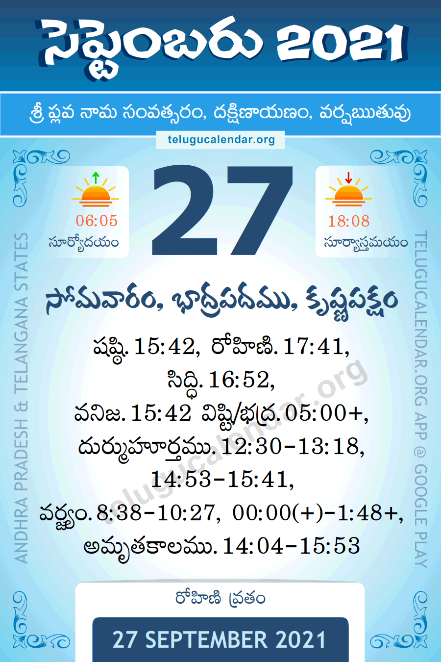 September 27, 2021 Panchangam Telugu Calendar Daily. Sri Plava Nama Samvatsaram, Dakshinayanam, Varsha Rutuvu, Bhadrapada Masam, Krishna Paksham.