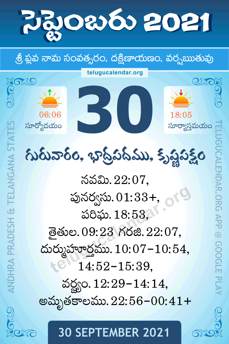September 30, 2021 Panchangam Telugu Calendar Daily. Sri Plava Nama Samvatsaram, Dakshinayanam, Varsha Rutuvu, Bhadrapada Masam, Krishna Paksham.