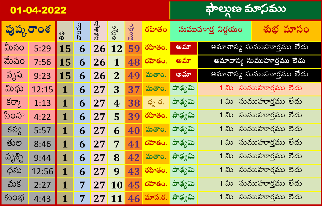 ఈ రోజు ముహూర్తాలు (1-4-2022) ఫాల్గుణ మాసము ఏప్రిల్ 1, 2022 తేదీ (పుష్కరాంశ, లగ్నం, రహితం) శుభ ముహూర్త సమయాల కోసం పైన పట్టికలో చూడండి.