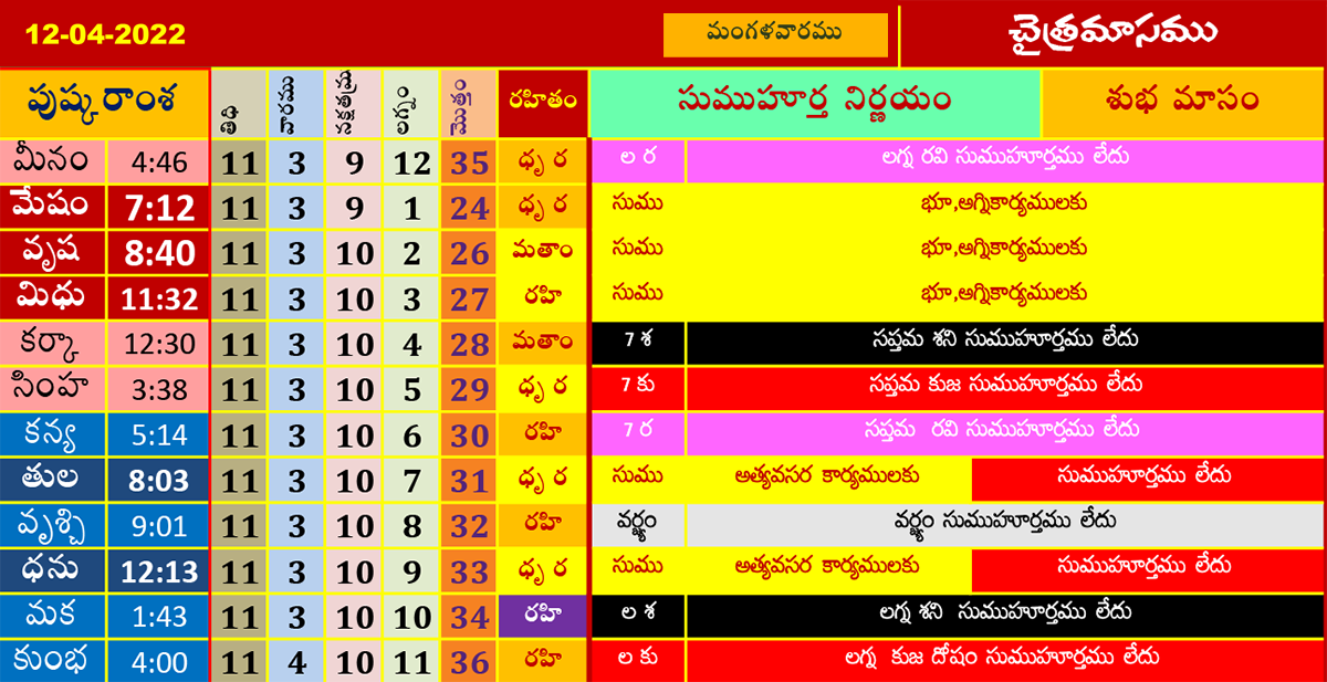 ఈ రోజు ముహూర్తాలు (12-4-2022) చైత్ర మాసము ఏప్రిల్ 12, 2022 తేదీ (పుష్కరాంశ, లగ్నం, రహితం) శుభ ముహూర్త సమయాల కోసం పైన పట్టికలో చూడండి.