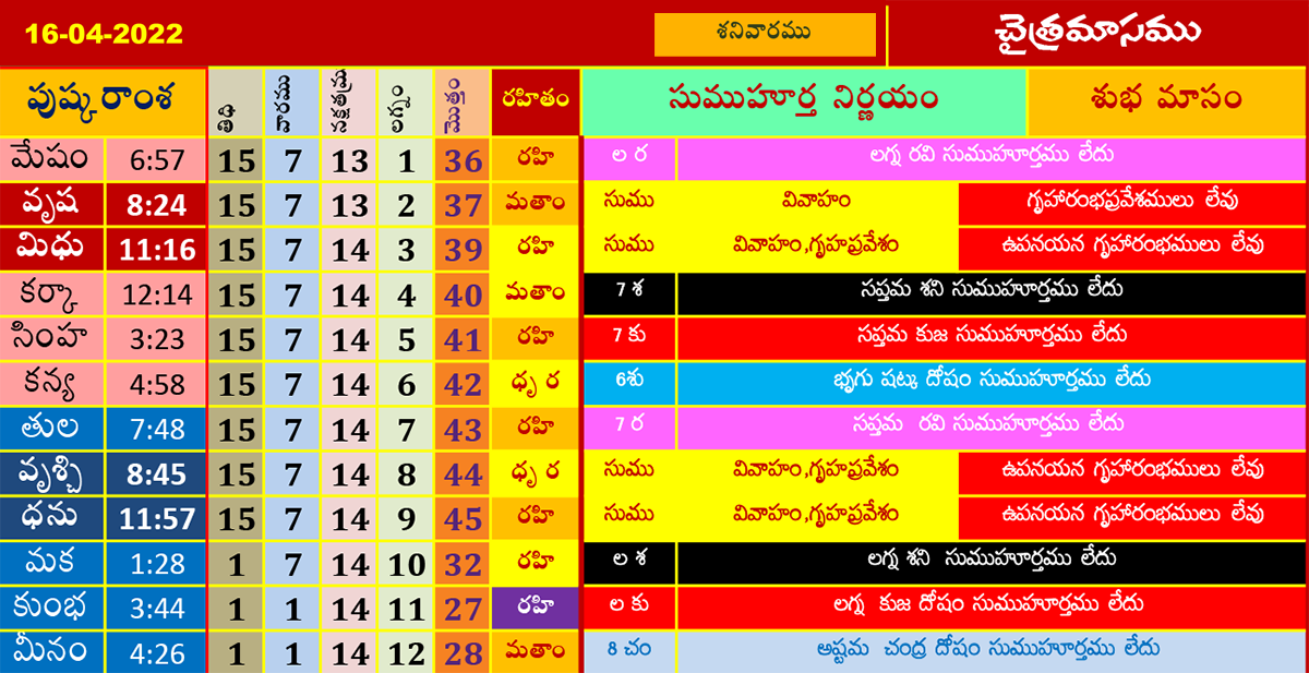 ఈ రోజు ముహూర్తాలు (16-4-2022) చైత్ర మాసము ఏప్రిల్ 16, 2022 తేదీ (పుష్కరాంశ, లగ్నం, రహితం) శుభ ముహూర్త సమయాల కోసం పైన పట్టికలో చూడండి.