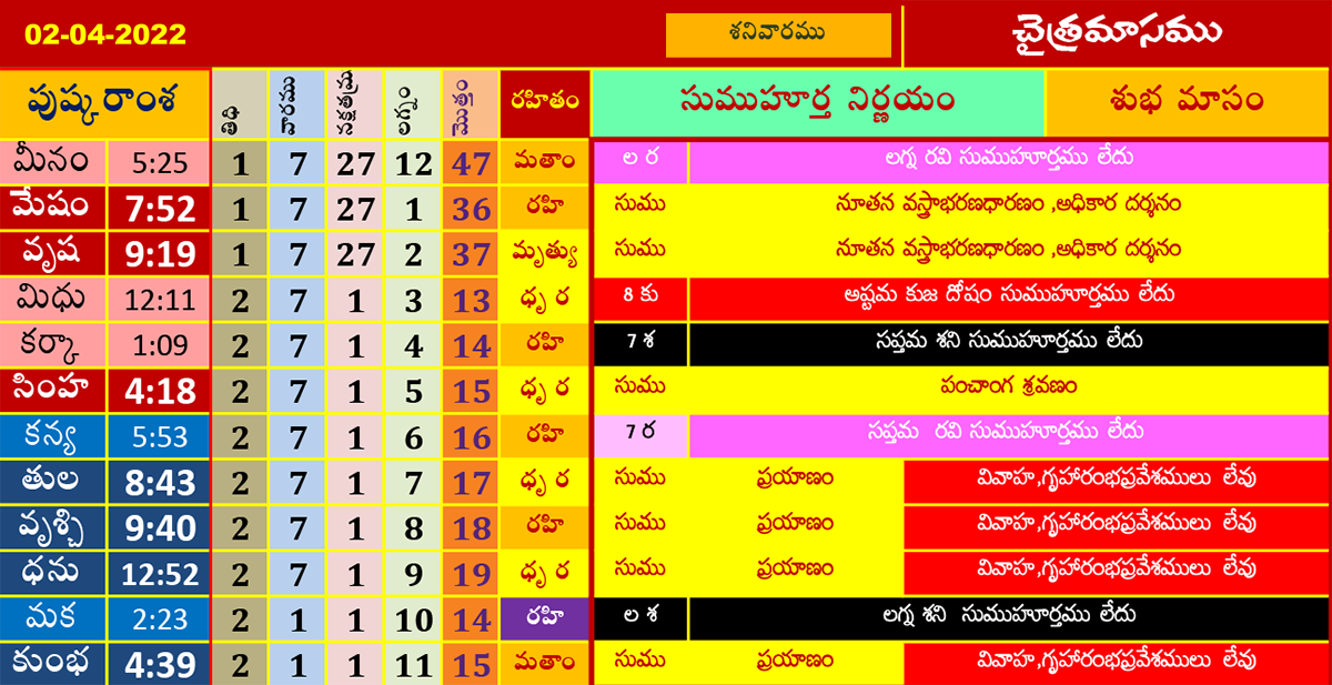 ఈ రోజు ముహూర్తాలు (2-4-2022) చైత్ర మాసము ఏప్రిల్ 2, 2022 తేదీ (పుష్కరాంశ, లగ్నం, రహితం) శుభ ముహూర్త సమయాల కోసం పైన పట్టికలో చూడండి.