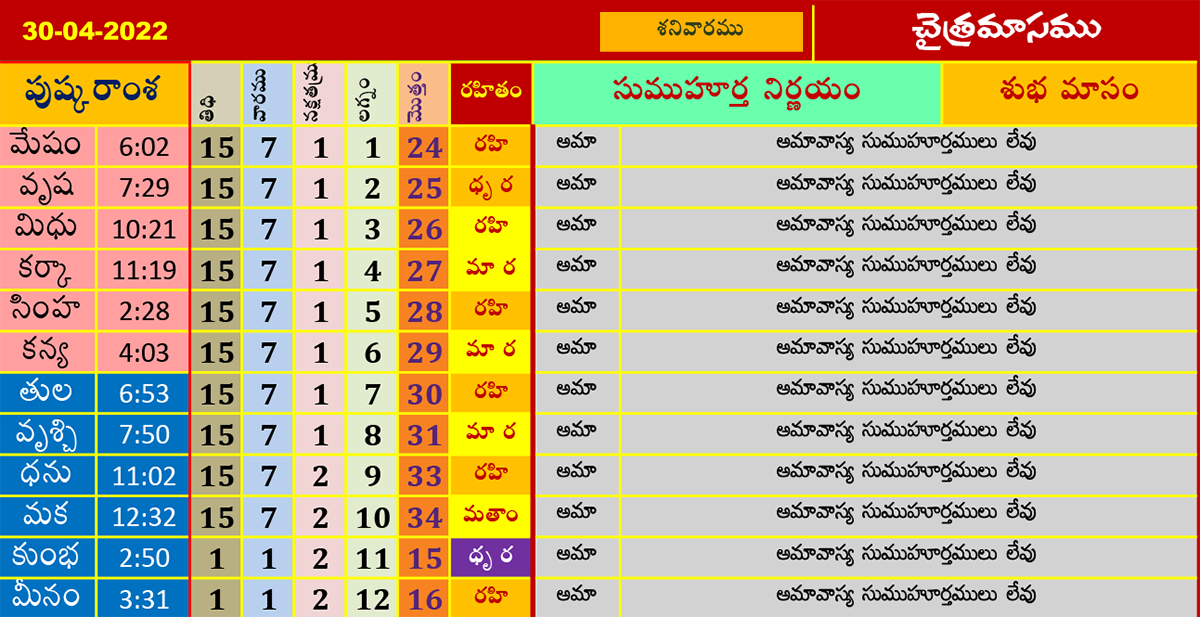 ఈ రోజు ముహూర్తాలు (30-4-2022) చైత్ర మాసము ఏప్రిల్ 30, 2022 తేదీ (పుష్కరాంశ, లగ్నం, రహితం) శుభ ముహూర్త సమయాల కోసం పైన పట్టికలో చూడండి.