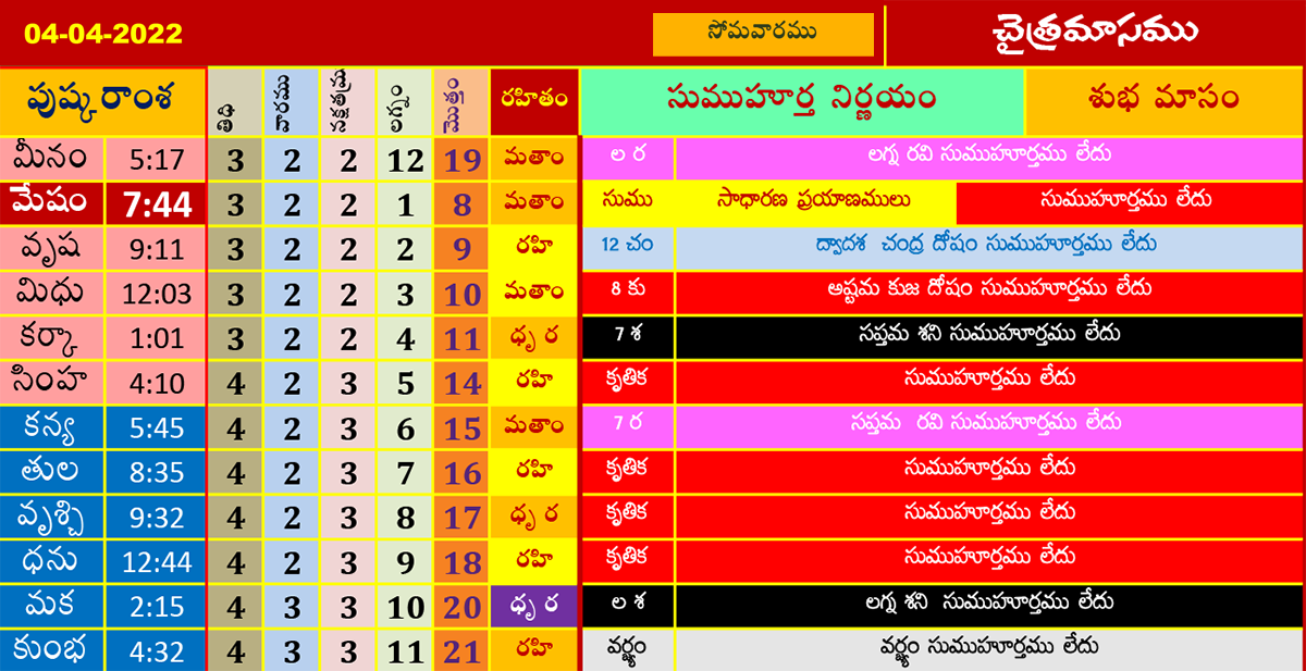 ఈ రోజు ముహూర్తాలు (4-4-2022) చైత్ర మాసము ఏప్రిల్ 4, 2022 తేదీ (పుష్కరాంశ, లగ్నం, రహితం) శుభ ముహూర్త సమయాల కోసం పైన పట్టికలో చూడండి.
