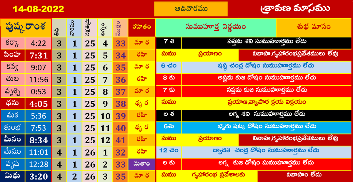 ఈ రోజు ముహూర్తాలు (14-8-2022) శ్రావణమాసము ఆగష్టు 14, 2022 తేదీ (పుష్కరాంశ, లగ్నం, రహితం) శుభ ముహూర్త సమయాల కోసం పైన పట్టికలో చూడండి.