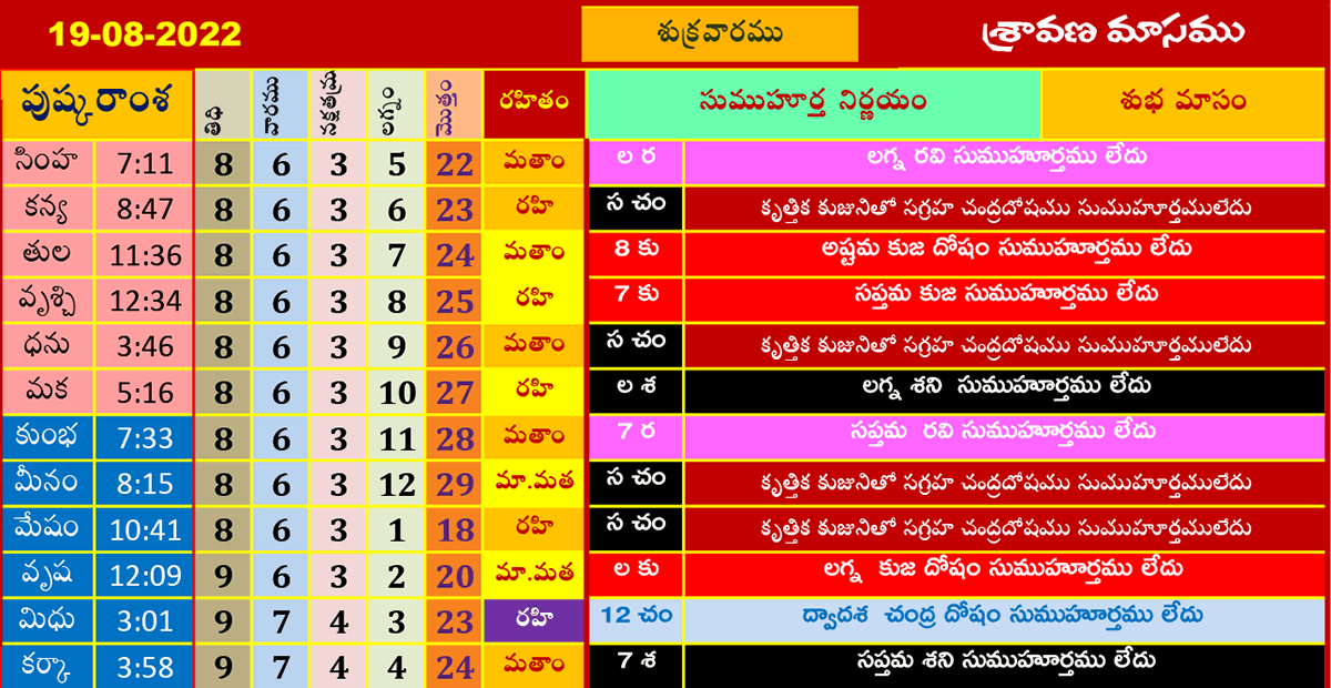 ఈ రోజు ముహూర్తాలు (19-8-2022) శ్రావణమాసము ఆగష్టు 19, 2022 తేదీ (పుష్కరాంశ, లగ్నం, రహితం) శుభ ముహూర్త సమయాల కోసం పైన పట్టికలో చూడండి.