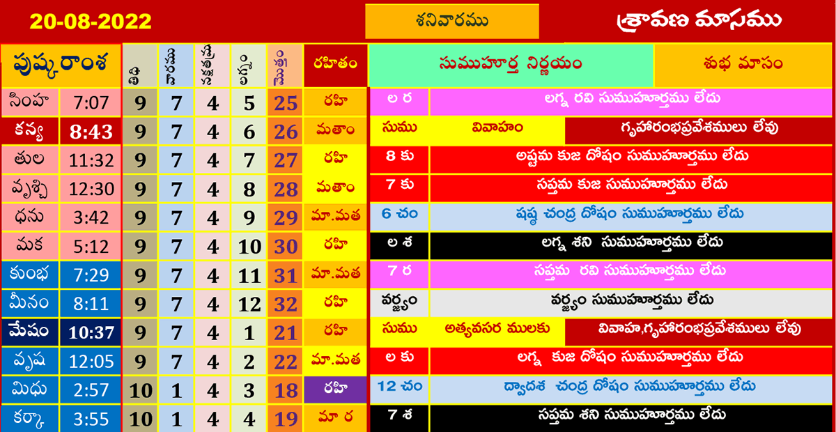 ఈ రోజు ముహూర్తాలు (20-8-2022) శ్రావణమాసము ఆగష్టు 20, 2022 తేదీ (పుష్కరాంశ, లగ్నం, రహితం) శుభ ముహూర్త సమయాల కోసం పైన పట్టికలో చూడండి.