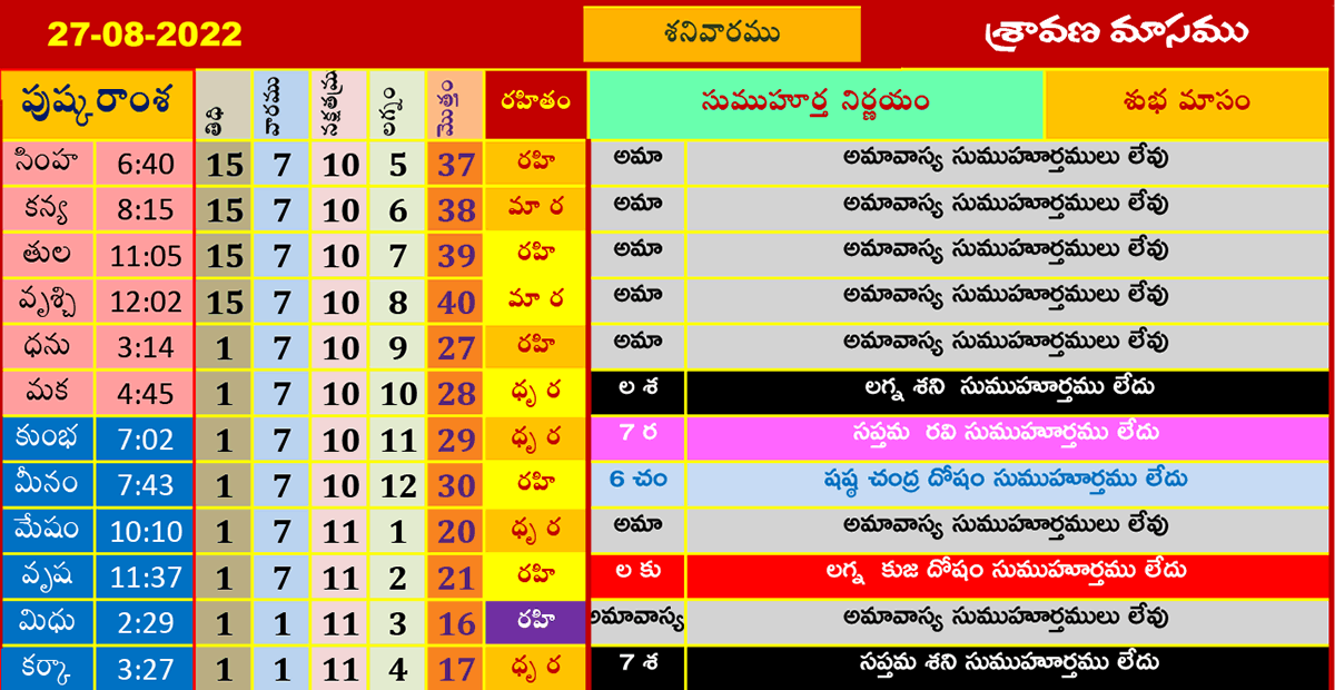 ఈ రోజు ముహూర్తాలు (27-8-2022) శ్రావణమాసము ఆగష్టు 27, 2022 తేదీ (పుష్కరాంశ, లగ్నం, రహితం) శుభ ముహూర్త సమయాల కోసం పైన పట్టికలో చూడండి.