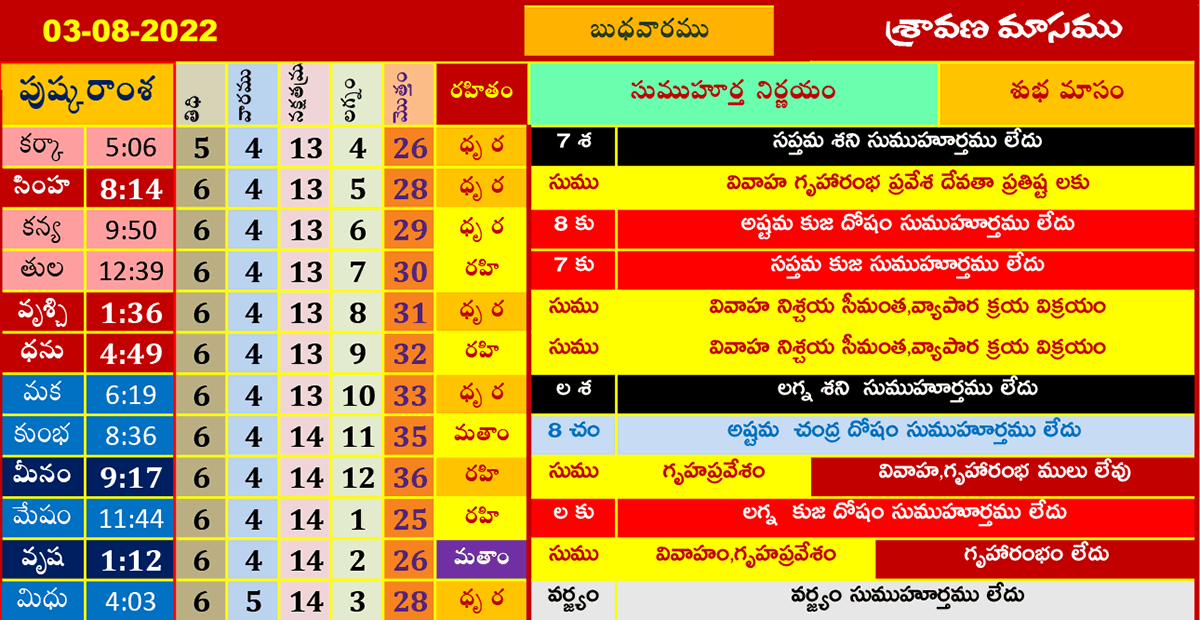 ఈ రోజు ముహూర్తాలు (3-8-2022) శ్రావణమాసము ఆగష్టు 3, 2022 తేదీ (పుష్కరాంశ, లగ్నం, రహితం) శుభ ముహూర్త సమయాల కోసం పైన పట్టికలో చూడండి.