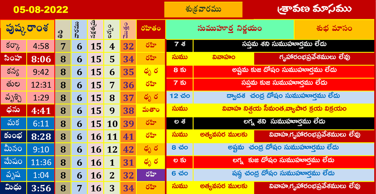 ఈ రోజు ముహూర్తాలు (5-8-2022) శ్రావణమాసము ఆగష్టు 5, 2022 తేదీ (పుష్కరాంశ, లగ్నం, రహితం) శుభ ముహూర్త సమయాల కోసం పైన పట్టికలో చూడండి.