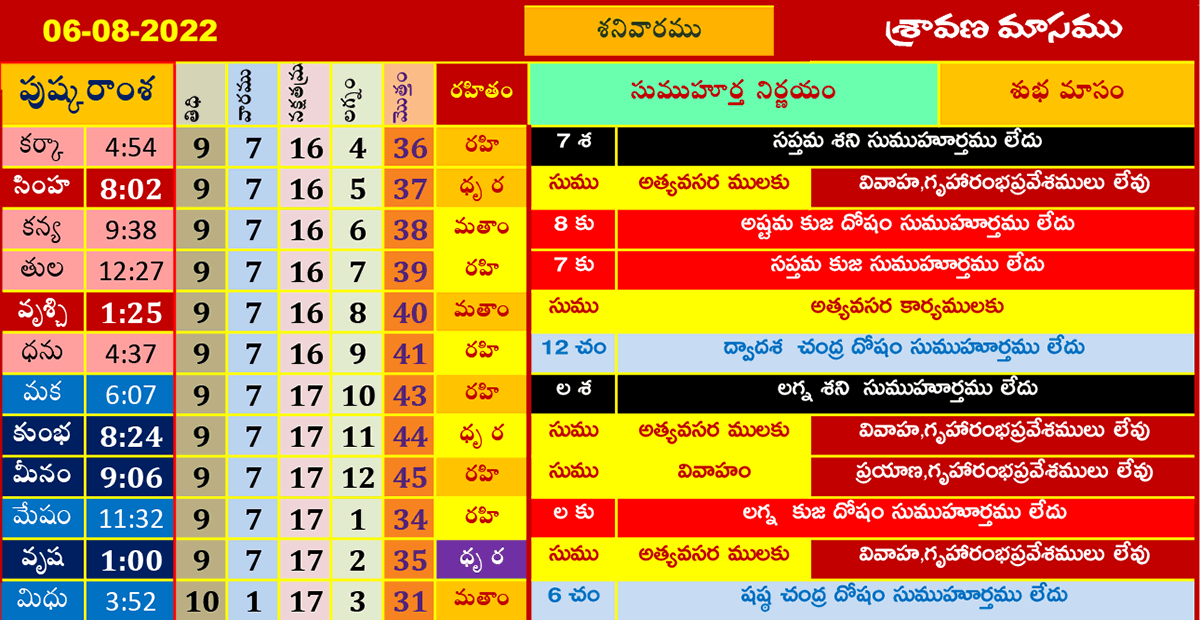 ఈ రోజు ముహూర్తాలు (6-8-2022) శ్రావణమాసము ఆగష్టు 6, 2022 తేదీ (పుష్కరాంశ, లగ్నం, రహితం) శుభ ముహూర్త సమయాల కోసం పైన పట్టికలో చూడండి.