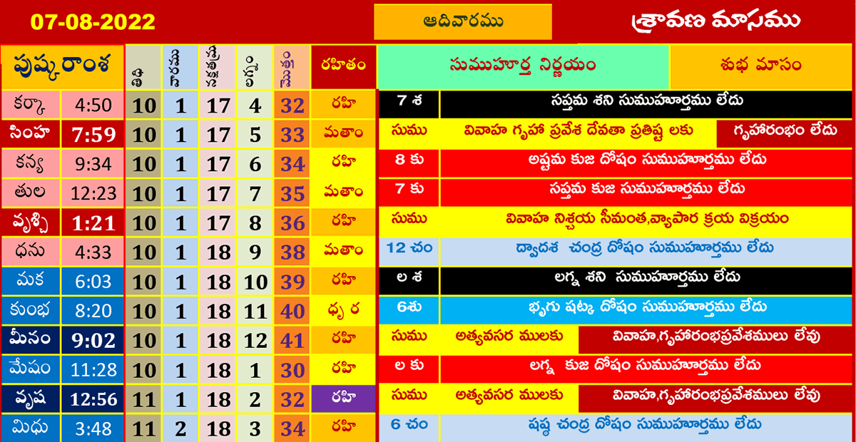 ఈ రోజు ముహూర్తాలు (7-8-2022) శ్రావణమాసము ఆగష్టు 7, 2022 తేదీ (పుష్కరాంశ, లగ్నం, రహితం) శుభ ముహూర్త సమయాల కోసం పైన పట్టికలో చూడండి.