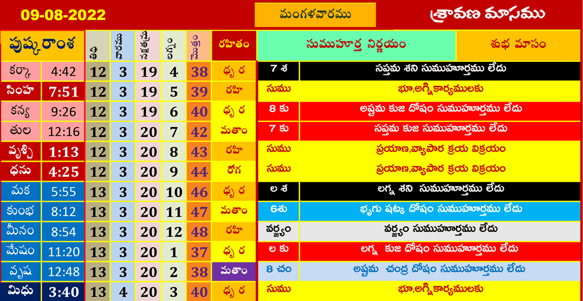 ఈ రోజు ముహూర్తాలు (9-8-2022) శ్రావణమాసము ఆగష్టు 9, 2022 తేదీ (పుష్కరాంశ, లగ్నం, రహితం) శుభ ముహూర్త సమయాల కోసం పైన పట్టికలో చూడండి.