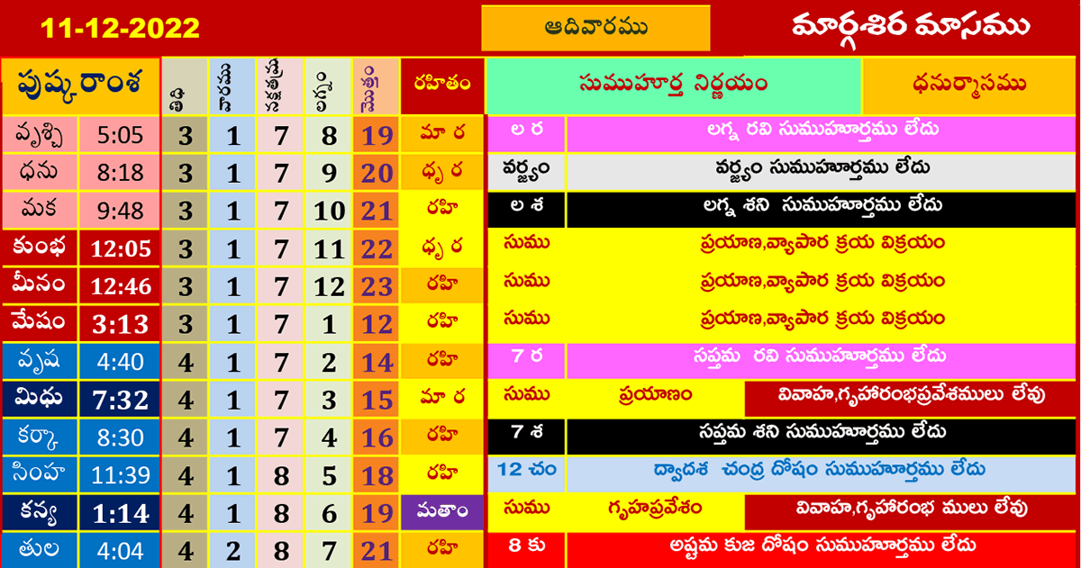 ఈ రోజు ముహూర్తాలు (11-12-2022) మార్గశిరమాసము డిసెంబర్ 11, 2022 తేదీ (పుష్కరాంశ, లగ్నం, రహితం) శుభ ముహూర్త సమయాల కోసం పైన పట్టికలో చూడండి.