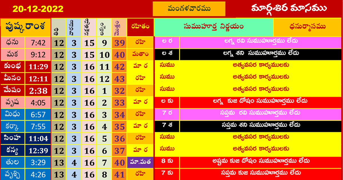 ఈ రోజు ముహూర్తాలు (20-12-2022) మార్గశిరమాసము డిసెంబర్ 20, 2022 తేదీ (పుష్కరాంశ, లగ్నం, రహితం) శుభ ముహూర్త సమయాల కోసం పైన పట్టికలో చూడండి.