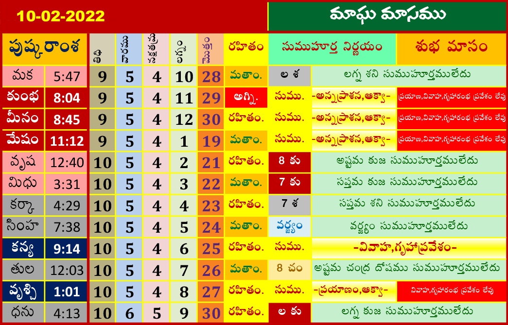 ఈ రోజు ముహూర్తాలు (10-2-2022) మాఘ మాసము ఫిబ్రవరి 10, 2022 తేదీ (పుష్కరాంశ, లగ్నం, రహితం) శుభ ముహూర్త సమయాల కోసం పైన పట్టికలో చూడండి.