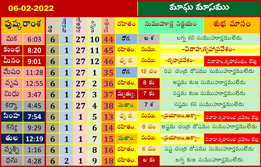 ఈ రోజు ముహూర్తాలు (6-2-2022) మాఘ మాసము ఫిబ్రవరి 6, 2022 తేదీ (పుష్కరాంశ, లగ్నం, రహితం) శుభ ముహూర్త సమయాల కోసం పైన పట్టికలో చూడండి.