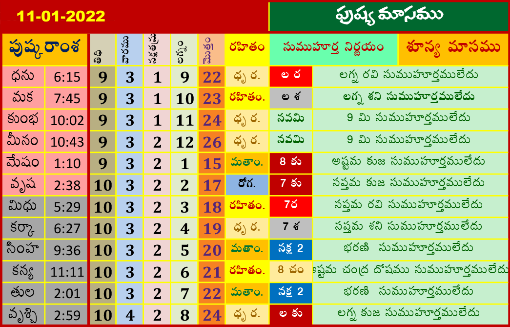 ఈ రోజు ముహూర్తాలు (11-1-2022) పుష్య మాసము జనవరి 11, 2022 తేదీ (పుష్కరాంశ, లగ్నం, రహితం) శుభ ముహూర్త సమయాల కోసం పైన పట్టికలో చూడండి.