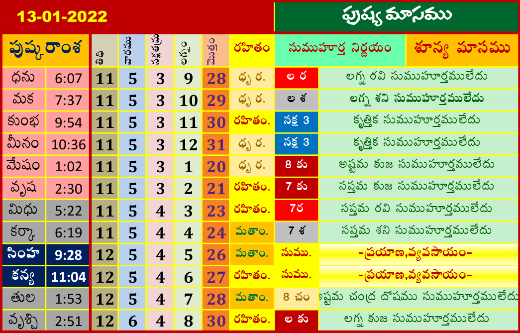 January 13, 2022 Telugu Subha Muhurtham Pushya Masam Dates