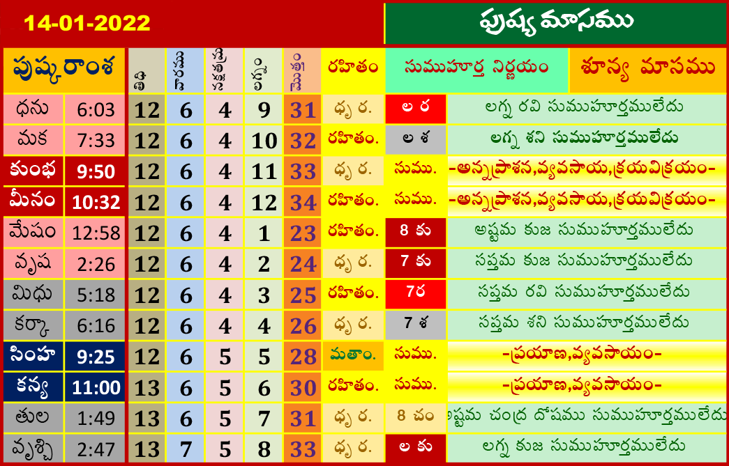 ఈ రోజు ముహూర్తాలు (14-1-2022) పుష్య మాసము జనవరి 14, 2022 తేదీ (పుష్కరాంశ, లగ్నం, రహితం) శుభ ముహూర్త సమయాల కోసం పైన పట్టికలో చూడండి.