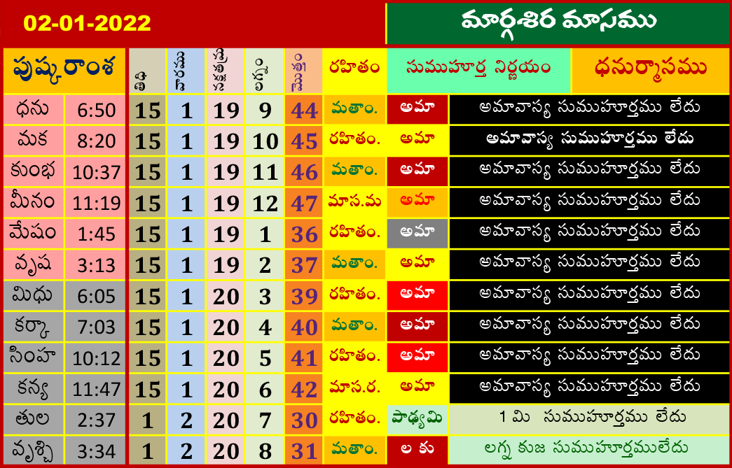 ఈ రోజు ముహూర్తాలు (2-1-2022) మార్గశిర మాసము జనవరి 2, 2022 తేదీ (పుష్కరాంశ, లగ్నం, రహితం) శుభ ముహూర్త సమయాల కోసం పైన పట్టికలో చూడండి.