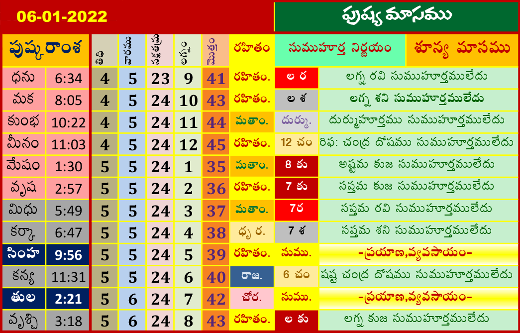 ఈ రోజు ముహూర్తాలు (6-1-2022) పుష్య మాసము జనవరి 6, 2022 తేదీ (పుష్కరాంశ, లగ్నం, రహితం) శుభ ముహూర్త సమయాల కోసం పైన పట్టికలో చూడండి.