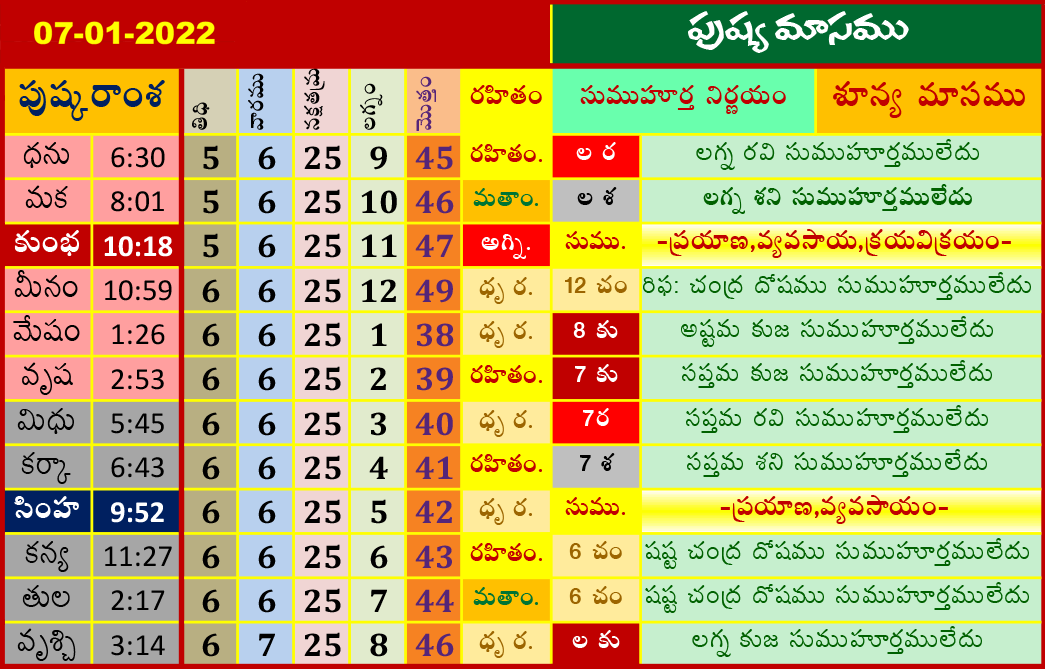 ఈ రోజు ముహూర్తాలు (7-1-2022) పుష్య మాసము జనవరి 7, 2022 తేదీ (పుష్కరాంశ, లగ్నం, రహితం) శుభ ముహూర్త సమయాల కోసం పైన పట్టికలో చూడండి.