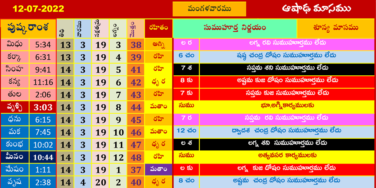 ఈ రోజు ముహూర్తాలు (12-7-2022) ఆషాఢమాసము జూలై 12, 2022 తేదీ (పుష్కరాంశ, లగ్నం, రహితం) శుభ ముహూర్త సమయాల కోసం పైన పట్టికలో చూడండి.