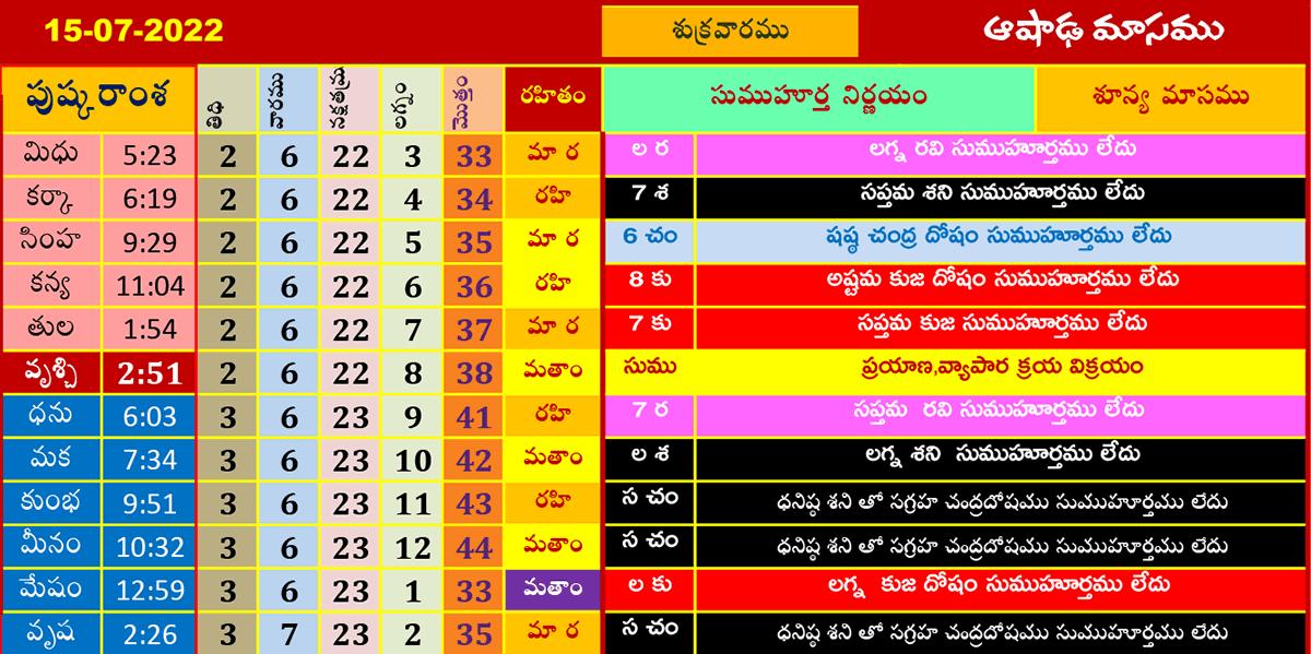 ఈ రోజు ముహూర్తాలు (15-7-2022) ఆషాఢమాసము జూలై 15, 2022 తేదీ (పుష్కరాంశ, లగ్నం, రహితం) శుభ ముహూర్త సమయాల కోసం పైన పట్టికలో చూడండి.