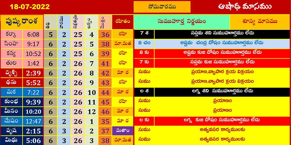 ఈ రోజు ముహూర్తాలు (18-7-2022) ఆషాఢమాసము జూలై 18, 2022 తేదీ (పుష్కరాంశ, లగ్నం, రహితం) శుభ ముహూర్త సమయాల కోసం పైన పట్టికలో చూడండి.