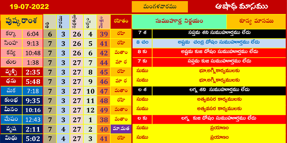 ఈ రోజు ముహూర్తాలు (19-7-2022) ఆషాఢమాసము జూలై 19, 2022 తేదీ (పుష్కరాంశ, లగ్నం, రహితం) శుభ ముహూర్త సమయాల కోసం పైన పట్టికలో చూడండి.