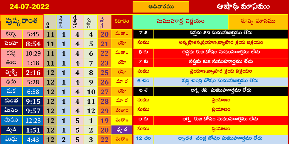 ఈ రోజు ముహూర్తాలు (24-7-2022) ఆషాఢమాసము జూలై 24, 2022 తేదీ (పుష్కరాంశ, లగ్నం, రహితం) శుభ ముహూర్త సమయాల కోసం పైన పట్టికలో చూడండి.