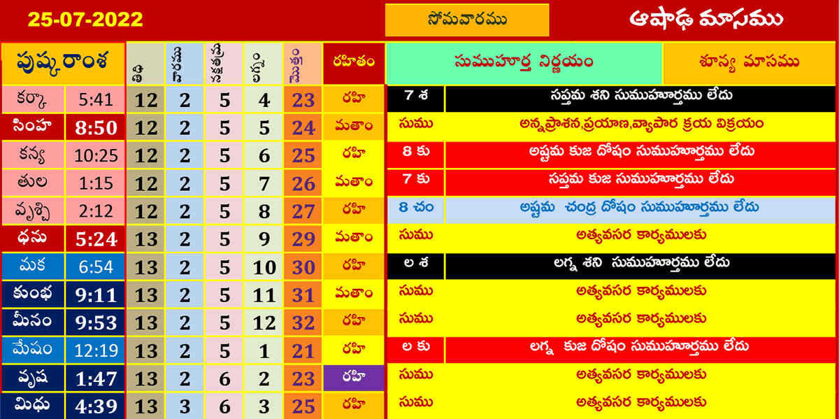 ఈ రోజు ముహూర్తాలు (25-7-2022) ఆషాఢమాసము జూలై 25, 2022 తేదీ (పుష్కరాంశ, లగ్నం, రహితం) శుభ ముహూర్త సమయాల కోసం పైన పట్టికలో చూడండి.